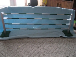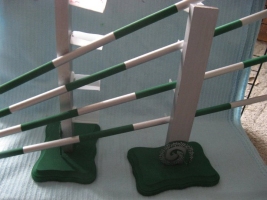 Supplies: 2 5X7 bases, 2 stands (1X2" and the height you want), 4 3ft dowels, 4 1.5" screws (screws may need to be longer depending on how thick the bases are). You will also need 8 1/2" screws and 8 film canisters for jump cups. If you are doing a taller jump, the bases may need to be larger.